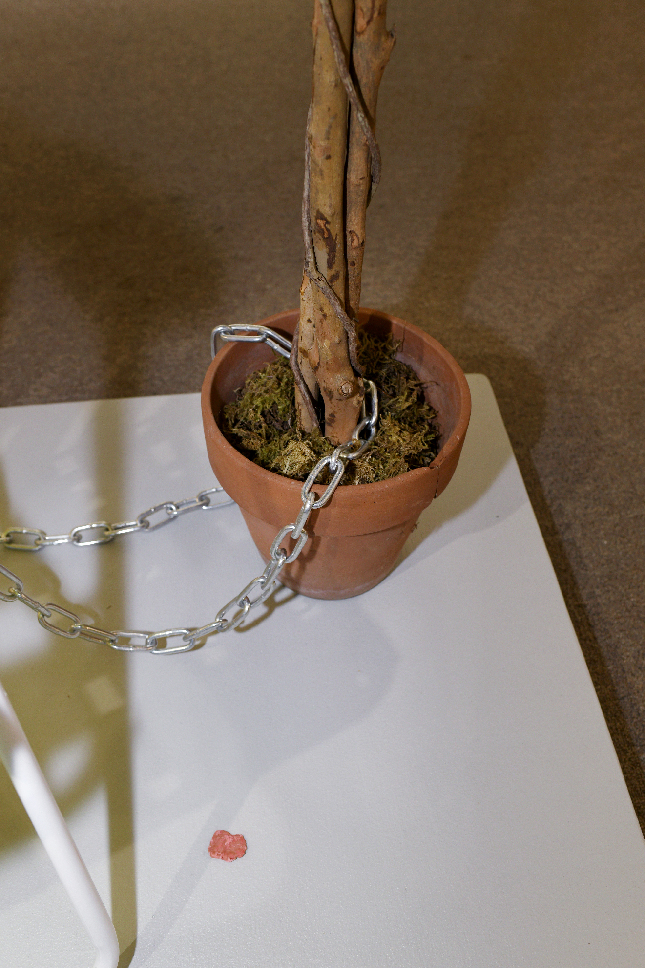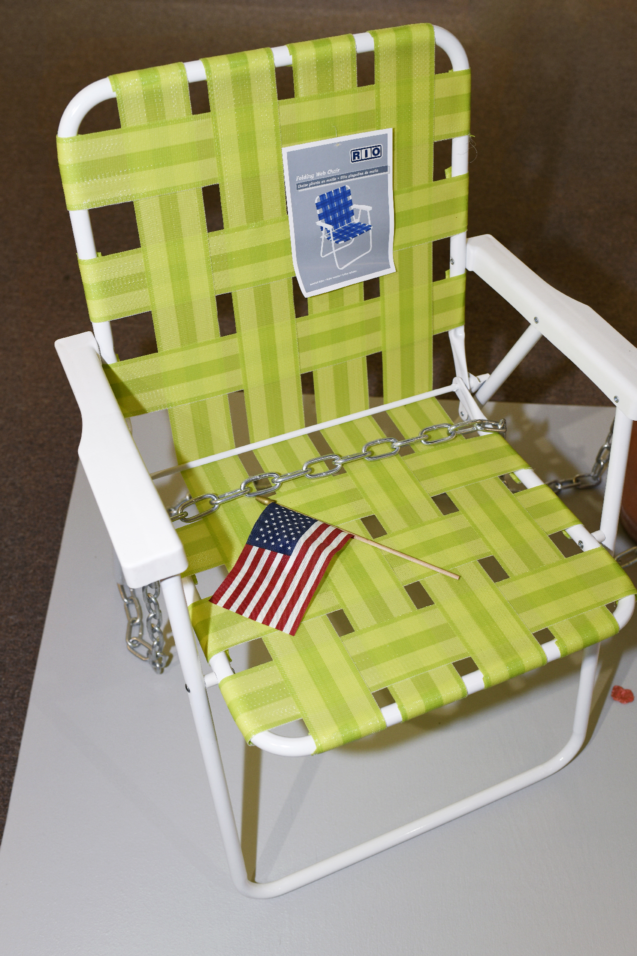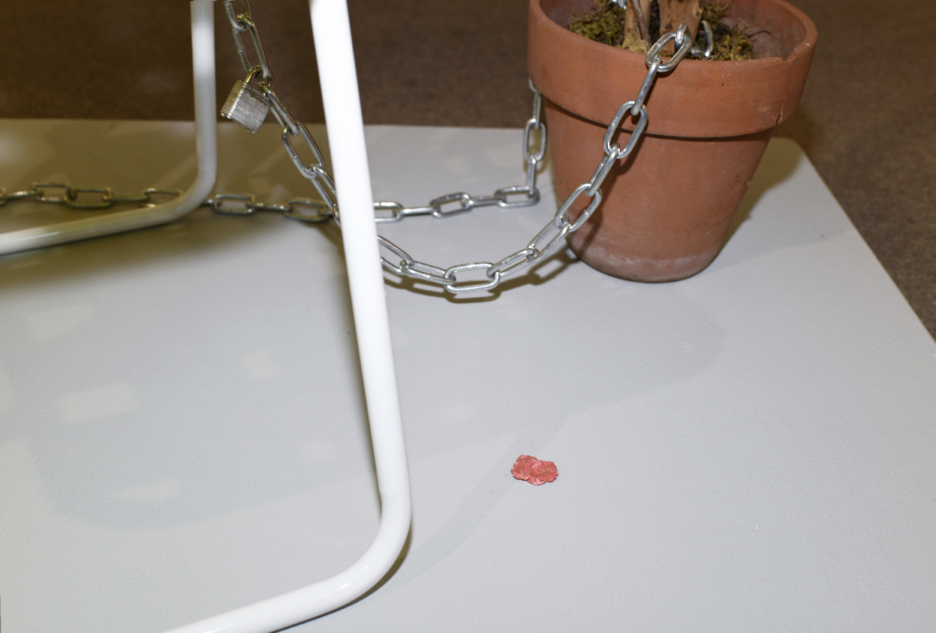 Wood, Acrylic Primer, Wood Filler, Spray Texture, Acrylic Paint, Folding Web Chair, Plastic Tree, Terracotta Pot, Artificial Moss, Aluminum Chainlink, Padlock, Chewing Gum, Hand Flag, Realistate Magazines