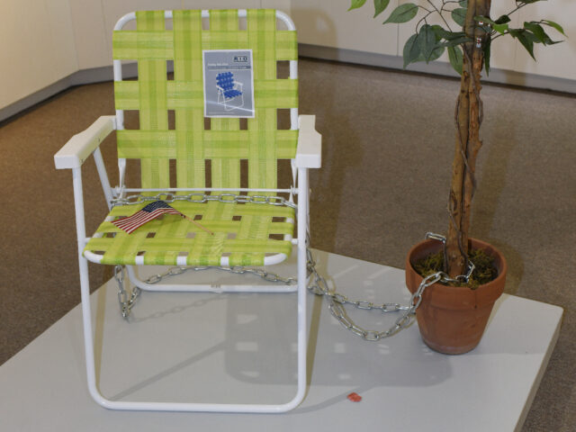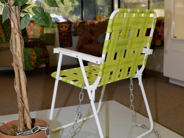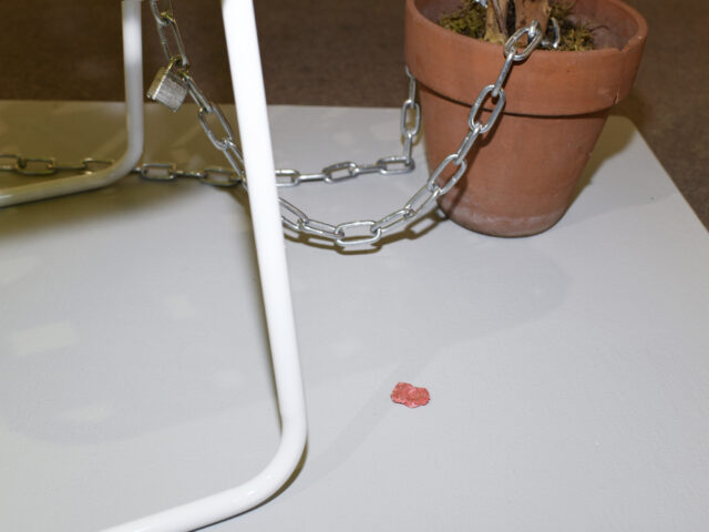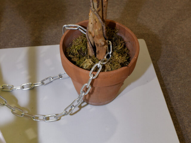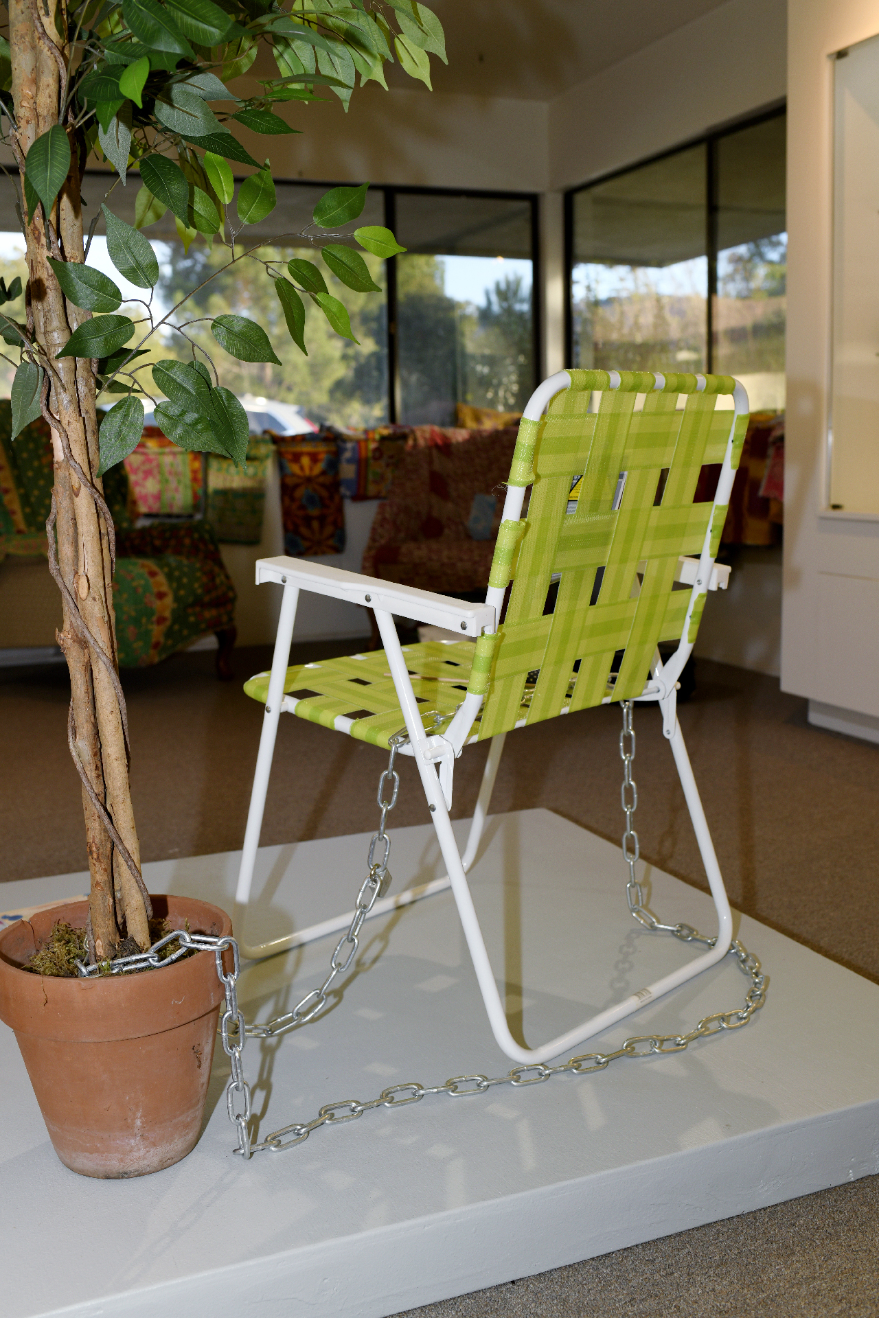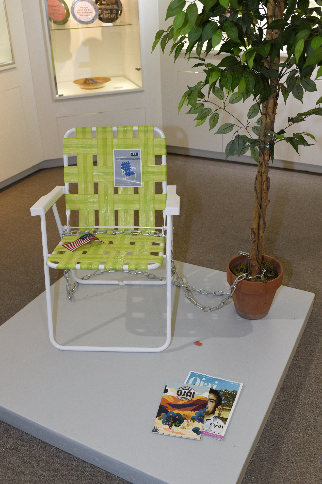 Wood, Acrylic Primer, Wood Filler, Spray Texture, Acrylic Paint, Folding Web Chair, Plastic Tree, Terracotta Pot, Artificial Moss, Aluminum Chainlink, Padlock, Chewing Gum, Hand Flag, Realistate Magazines